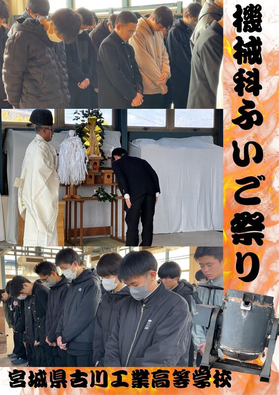令和7年11月27日(木)、機械科3年生を対象に「ふいご祭り」が執り行われました。ふいご祭りとは、鍛冶屋や鋳物師など「ふいご(送風器)」を用いる職人が、火の神様に感謝を捧げ、仕事道具を清める伝統行事です。火の神や稲荷神への感謝を表し、仕事の安全を祈願するために、毎年欠かさず行われています。