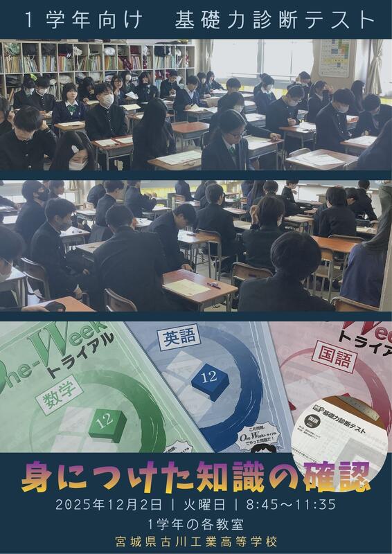 令和7年12月2日(火)1学年対象に基礎力診断テストを実施しました。国語・数学・英語の3教科を実施し、高校1年生までに必要な知識の確認を行いました。この結果を、今後の進路活動に生かしてほしいと思います。