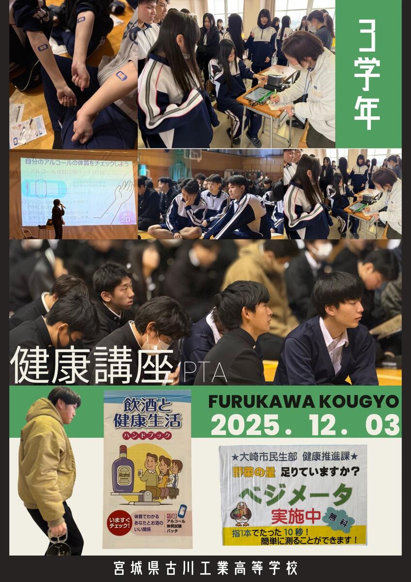令和7年12月3日(火)健康講座を実施しました。3時間の中で栄養・アルコールについての講話、心の健康についての講話、健康測定として握力測定、骨ウェーブ、ベジメータの測定などを行いました。PTA活動の一環として保護者の方にも参加していただき、活動しました。講師の先生方、保護者の皆様ありがとうございました。