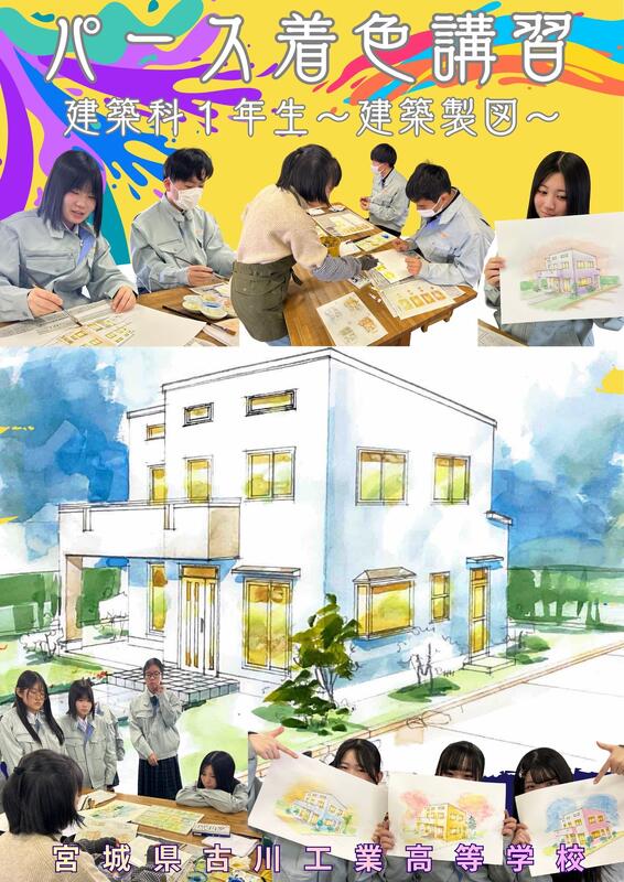 令和7年12月4日(木)、「建築製図」の授業にて、外部講師をお招きし、「パース着色講座」を実施いたしました。本講座では、着色の基本や陰影のつけ方に加え、実務におけるプレゼンテーション技法など、専門性の高い実習を行いました。生徒たちにとって、これから始まる自由設計課題に取り組む上での具体的なヒントや実践的な学びを得る貴重な機会となりました。