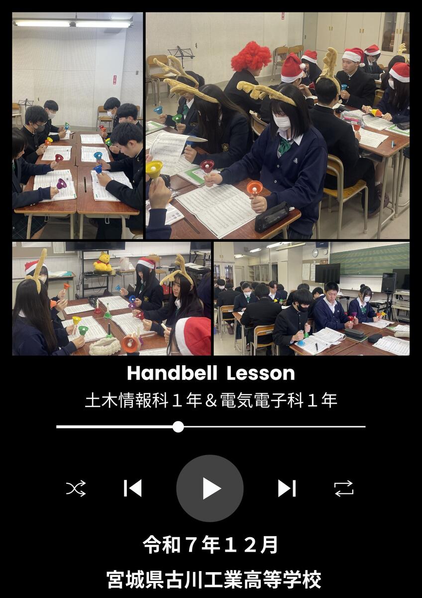 音楽ではハンドベルの授業を行っています。パッヘルベルのカノンやジブリのアニメメドレーなど楽しく演奏しています。サンタやトナカイの被り物で盛り上がっています♪