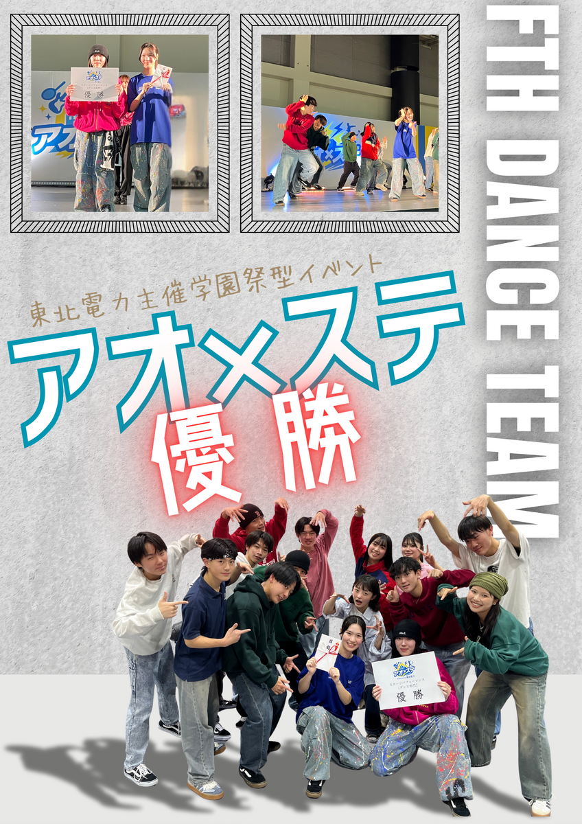 令和7年12月21日(日)にサンフェスタで行われた東北電力主催学園祭型イベント「アオ×ステ」のダンスステージに参加し、来場者からの投票の結果「優勝」することができました。他にもバンドステージや学生考案のオリジナルフードキッチンカーや、シンガーソングライターの有華さんのスペシャルライブで会場は盛り上がっていました。私たちのステージを見て一緒に盛り上がっていただき、誠にありがとうございました。引き続き応援よろしくお願いいたします。