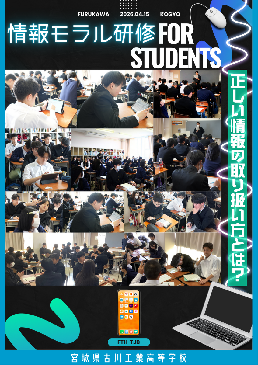 令和8年4月15日(水)生徒向け情報モラル研修を実施しました。ネットは「自由」だが「無責任」ではないということを学び、自分で考えて判断できる力を身に付けるため、グループワークを行いながらお互いに理解を深めていました。