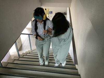 令和6年7月9日(火)5・6校時は3年建築科の総合実習の様子を紹介します。本日の授業では、擬似体験実習を行いました。視覚や聴覚の障害を擬似体験することで、建物内の段差やスロープ等をどのように工夫して設計するべきか、バリアフリーやユニバーサルデザインがどうあるべきか考えるきっかけとなってほしいです。