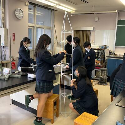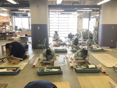 令和6年12月19日(木) 建築科の課題研究の時間です。課題研究も佳境に入り、慌ただしくなってきました。建築工房班は花を置く台やボールを入れる籠の制作中。造形制作班と自由設計班は1月23日の発表に向けて資料制作に取り組んでいます。さすが3年生です。忙しさの中にも笑顔があります。発表が楽しみです!