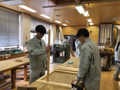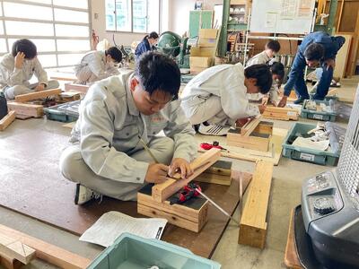 令和7年11月17日(月)建築科の課題研究の様子です。建築工房班ではベンチ、クラスボックス、工具収納BOXの作成、造形制作班では表札づくり(釜神様は出張中)、自由設計班では発表練習と成果物の掲示をしていました。意欲的に活動している姿からは充実感が伝わってきました。発表会に向けて頑張ろう!