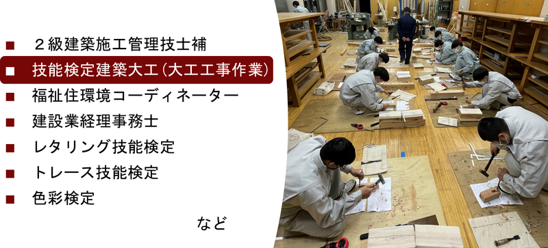 令和6年11月28日(木)講習に真剣に取り組む生徒たちの様子です。技能検定「建築大工」は、木造建築の大工工事に必要な技術を証明するための国家資格です。技能向上・試験合格を目指してみんな頑張れ!