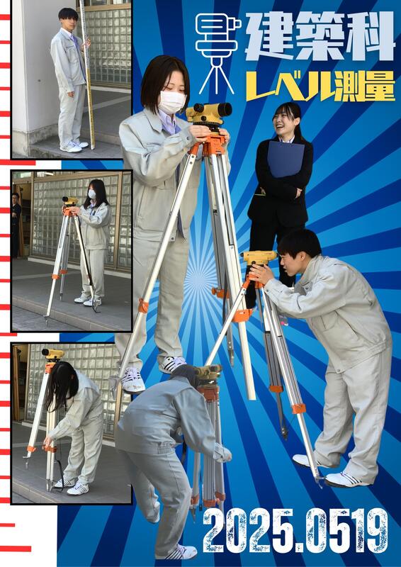 令和7年5月19日(月)2・3校時で、建築科2年生による建築実習を行いました。本日の実習は、レベル測量の据付け練習です。三脚の設置を早く正確に行うために、友達どうしで競い合いながら楽しく実習を行っていたようでした。