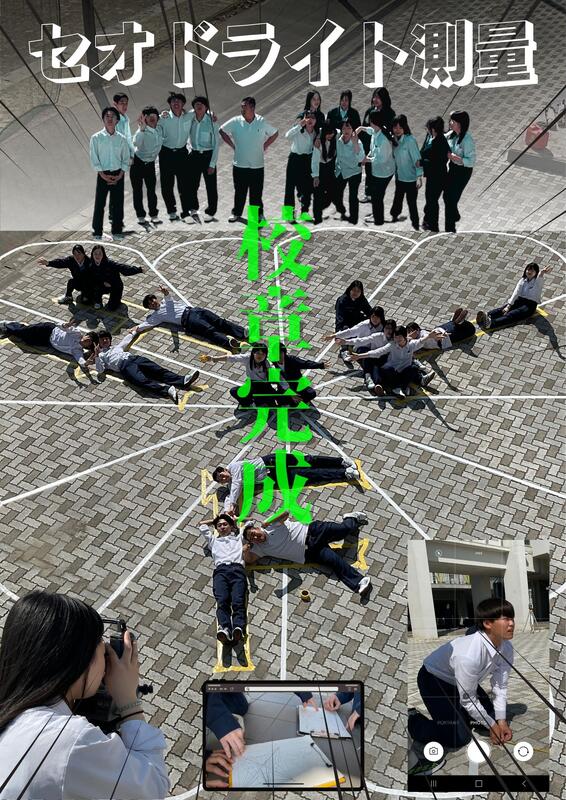 令和7年6月13日(金)3年生 セオドライト測量実習の様子です。班のメンバーと協力しながら、中庭に校章を描きました!