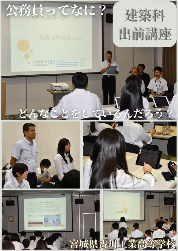 令和7年7月17日(木)1校時、大崎市建設部建築住宅課・建築指導課職員の方を講師としてお招きし、建築科1・2年生を対象とした公務員(建築職)の業務に関する出前講座を実施しました。