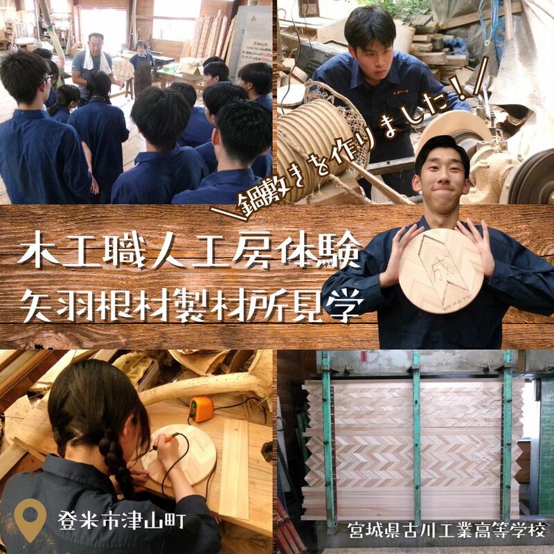 令和7年7月23日(水)課題研究 建築工房班の生徒12名が、登米市津山町にある木工職人工房で、矢羽根木工品の鍋敷き製作を体験しました。体験では、まず木工旋盤を使って八角形の矢羽根材を丸く加工しました。最初は高速で回転する旋盤に少し戸惑いと怖さがありましたが、佐々木喜一さんご夫妻に優しくご指導いただいたおかげで、安心して作業に取り組むことができました。その後、焼きペンで絵付けを行い、生徒それぞれが個性豊かなオリジナル作品を完成させることができました。