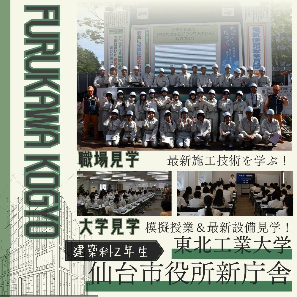 令和7年8月28日(木)、建築科2年生は校外学習として、東北工業大学と仙台市役所新庁舎の工事現場を見学しました。東北工業大学では、大学の概要説明と模擬授業を体験。仙台市役所新庁舎の工事現場では、最新の施工技術や建設業についての説明をしていただいた後に、実際の工事現場を見学させていただきました。生徒は終始、興味深そうな表情で説明を聞いており、積極的に質問もしていました。学校とは違うキラキラした表情が印象的でした。ご協力いただいた皆様に心より感謝申し上げます。