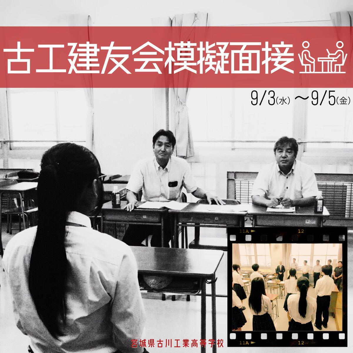 令和7年9月3日(水)~5日(金)まで、古工建友会(本校建築科卒業生の会)主催による模擬面接が、本校を会場にして実施されました。OB・OGの皆さんを模擬面接官として、就職希望の生徒24名が挑戦しました。とても緊張しましたが、就職試験に向けて貴重なアドバイスをたくさんいただきました。お忙しい中、ご指導いただきありがとうございました。