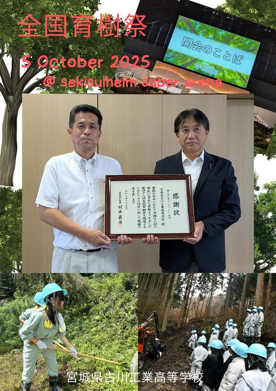 令和7年10月5日(日)、セキスイハイムスーパーアリーナで開催された「第48回全国育樹祭」において、「緑と共に歩む人づくり部門」で感謝状の贈呈を受けました。