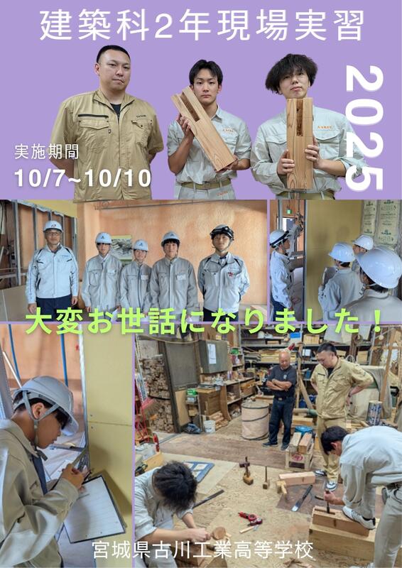 令和6年10月7日(月)~10日(木)の日程で、建築科2年生32名が産業現場実習(インターンシップ)を行いました。今年で20回目となるインターンシップは、本校建築科OB会である建友会の協力の下、地元大崎地域の企業を中心に15事業所にお世話になりました。生徒達は学校での学習が実際の建設現場でどのように活用されているのか、実践的・体験的に学習することができ有意義な時間を過ごすことができたようです。ご協力頂いた事業所の皆様、建友会の方々どうもありがとうございました。