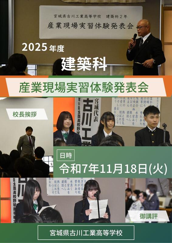 令和7年11月18日(火)建築科2年生による産業現場実習(インターンシップ)体験発表会を実施しました。体験発表会には、2年生の保護者と1年生、インターンシップにご協力いただいた事業所の皆様にも多数ご参加いただきました。ご多忙の中、本行事にご参加、ご協力いただきました皆様に、心より深く御礼申し上げます。
