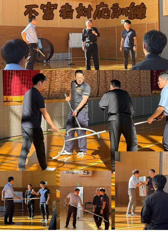 令和7年6月17日(火)教職員向けの不審者対応訓練の様子です。不審者が実際に校舎内に入って来たときにどのようにすればいいのか、その対応方法やさすまたの使い方について教えていただきました。生徒たちを不審者から守るために必要なことを学ぶことができました。