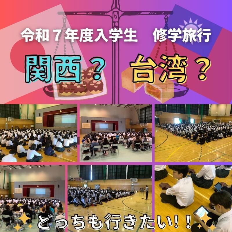 令和7年6月23日(月) 1学年の生徒と保護者を対象とした修学旅行説明会を体育館で実施しました。関西方面と台湾方面のそれぞれについて旅行会社の担当者から詳細な説明がありました。来年度の修学旅行に向けた貴重な説明会となったようでした。