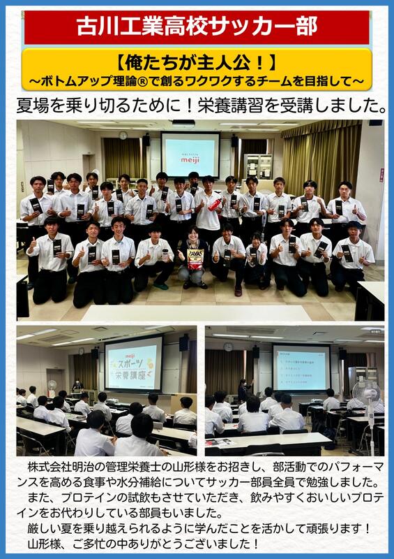 令和7年6月30日(月) サッカー部員全員を対象に、栄養講習を行いました。講師は株式会社明治の管理栄養士、山形様にご来校いただきました。食事や栄養のプロの方からのお話は、全てが生徒にとってプラスになるものでした。これから暑く厳しい夏が始まりますが、山形様から学んだ食事や水分補給について、部活動で活かしていきたいと思います。