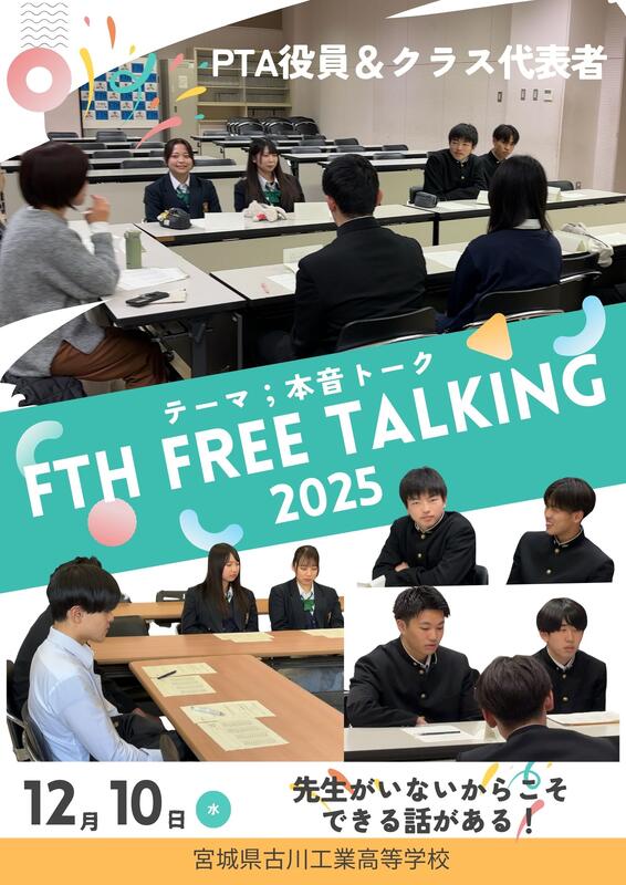 令和7年12月10日(水)古工フリートーキングを実施しました。今回のテーマは「本音トーク」です。PTA健全育成委員会に所属する保護者の方々がコーディネーターとなり、さまざまな角度から意見交換を行いました。最初は口数の少なかった生徒たちも、後半は緊張がほぐれ日々の思いや意見を自由に述べていました。