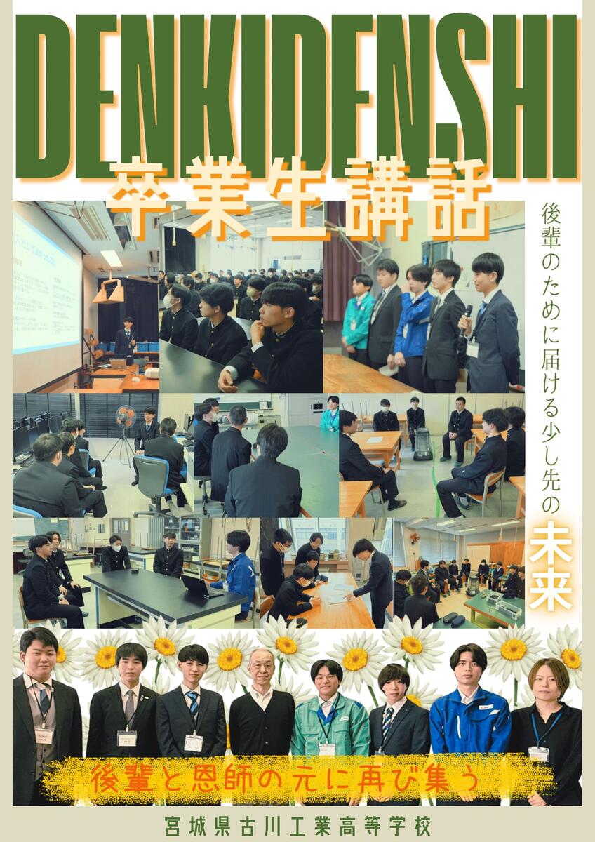 令和8年3月19日(木)、卒業生講話を実施しました。令和5年度卒業生の先輩方が、現1・2年生のため、2年ぶりに全国各地から古川工業高校に集まりました。全体会では、それぞれ卒業後に経験した仕事の内容や、学んだことについてのお話、残りの高校生活の過ごし方についてのアドバイスをいただきました。また、進路別のフリートーキングでは、それぞれの進学先・就職先について、より具体的なお話を伺うことができました。立派な社会人として成長した卒業生たちは恩師との再会も果たし、生徒のみならず教員にとっても充実した内容となりました。卒業生の皆さん、これからも体に気を付けて頑張ってください。また、講師を派遣していただいた各企業、大学の関係者の皆様に厚くお礼を申し上げます。