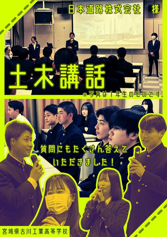 令和8年3月19日(木) 土木情報科1・2年生を対象に、日本道路株式会社から講師の方をお招きして講話をしていただきました。2年生には3年生になり進路を考える上で参考になるお話を、1年生には土木施工管理がどのような仕事なのかを講話していただきました。また、卒業生も一緒に来校し、実際にどのような仕事をしているか、働くうえで大事なことなどを在校生に伝えてくれました。日本道路株式会社の講師の皆様、有意義なお話をありがとうございました!