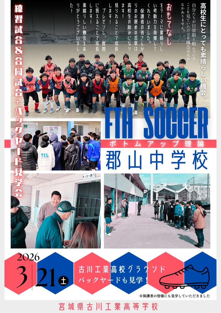 仙台市立郡山中学校の安倍先生が顧問をしているサッカー部さんがわざわざ古川まで来ていただき、練習試合&合同試合+バックヤード見学会を行いました。私たちのミッションの一つに「小・中学生に憧れを持たれる」があります。「来て良かった!」と思っていただけるような活動を目指し、これからも生徒と共創しながら成長していきたいと思います。仙台市立郡山中学校サッカー部の皆さん、安倍先生ありがとうございました!