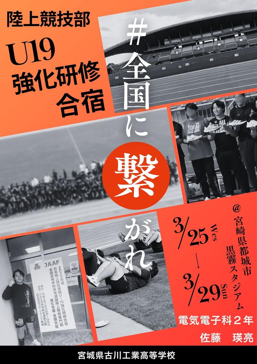 令和8年3月25日(水)から29日(日)にかけて、本校陸上競技部の佐藤瑛亮(電気電子科2年)が強化研修合宿に参加しています。この合宿は全国のトップ選手たちが集って行われており、開催地は宮崎県となります。来年度の大会でもさらなる活躍に向けて大いに期待しましょう!