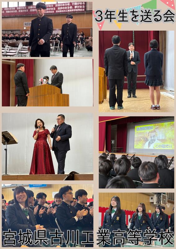 令和8年2月27日(金)、3年生を送る会を行いました。吹奏楽部の演奏に合わせて3年生が入場してくるところから始まり、自転車競技部の壮行式、皆勤賞やジュニアマイスターなどの表彰、そして建築科3年生の早坂勇臥君と音楽の佐々木美香先生の歌唱、生徒会企画のビデオ放映など様々な出し物をしてくれました。今までの感謝を込めて3年生を送り出していました。