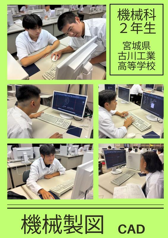 令和7年9月2日(火)、機械科2年生の機械製図の様子です。前期前半では手書きの製図を行っていたのですが、前期後半ではパソコンを使って行う製図である「CAD」に取り組んでいます。分からないところを生徒同士で教え合いながら、楽しく製図をしています!