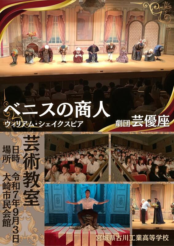 令和7年9月3日(水)に村田工務所パタ崎さんHallおおさき(大崎市民会館)において、毎年恒例の芸術教室が行われました。今年度の内容は、(株)劇団芸優座様による「ベニスの商人」でした。生徒の皆さんはもちろん、教職員にとっても有意義な時間となりました。講演していただいた劇団芸優座様、大変ありがとうございました。