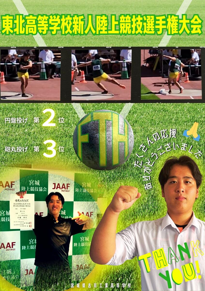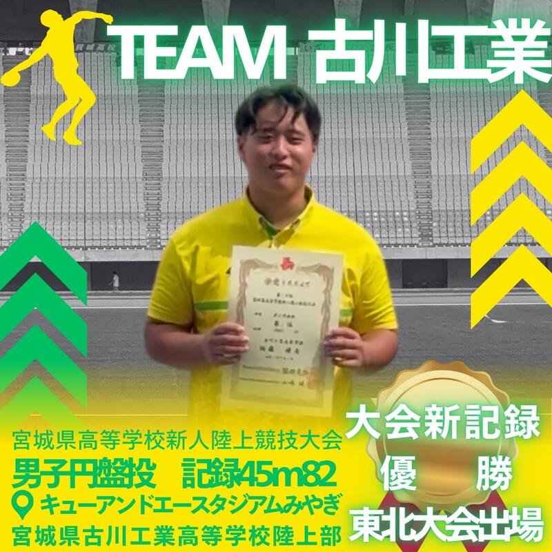 相田 柚葵(M21)が5000mで第5位入賞を果たし、佐藤 瑛亮(E2)が男子砲丸投において13m16で第3位、男子円盤投において45m82という大会新記録で優勝を果たし、東北新人大会への切符を掴みました。