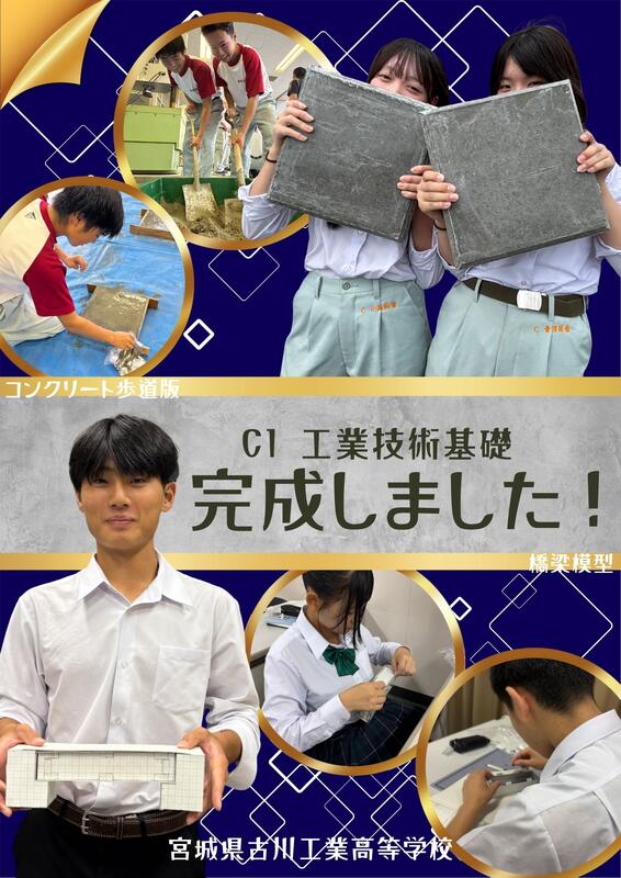 夏休み前にも記事にしました、土木情報科1年の工業技術基礎「歩道版作成」「橋梁模型作成」ですが、完成しました!歩道版の班は、1年生初めてのコンクリート練りで、自分で作った型枠に自分たちで練ったコンクリートを流して養生し、完成させました!橋梁模型班は、自分で厚紙に製図した部材を、カッターで切り取り、接着剤で貼り合わせて無事橋梁模型の形にできました!今週はテストだそうなので、実習で学んだことをしっかり復習しておこう!