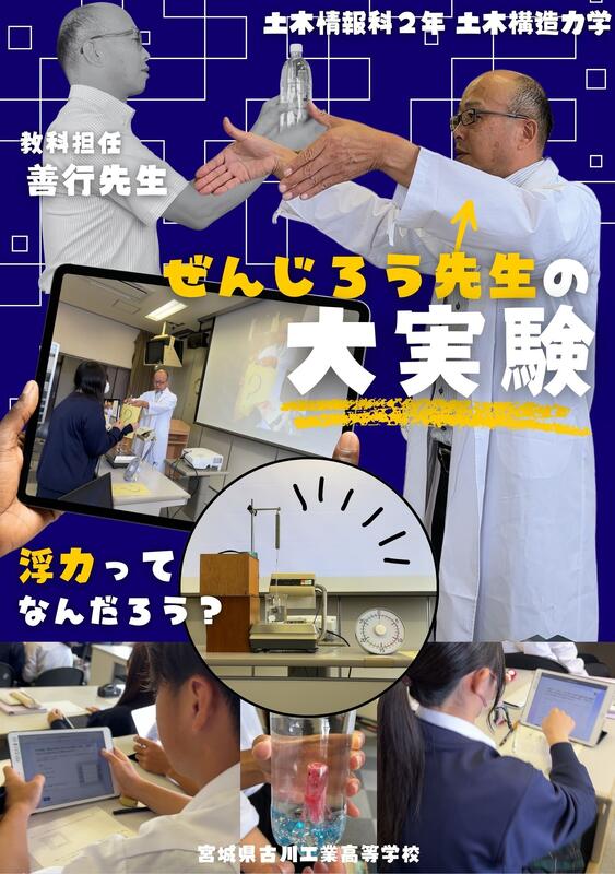 令和7年9月17日(水) 土木情報科2年生の土木構造力学の授業で、面白い実験をしていました。いつもの教科担任・鈴木善行先生に代わり、白衣が素敵なスペシャルゲストの「ぜんじろう先生」が、水中におもりを入れて、ばねばかりと台ばかりの目盛りがどうなるか、水深で重さは変わるのか、おもりを底につけたときにはどうなるかという実験から、浮力についての理解を深めていました。iPadを巧みに使い、遠くにいる生徒にも分かりやすいように、また、生徒の考えも見える化してお互いの考えを共有できる、素晴らしい授業でした!生徒もぜんじろう先生の実験に終始興味津々でした。
