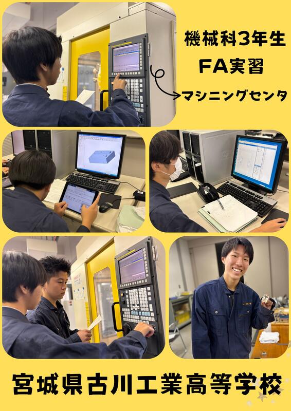 これは、3年生のFA実習の様子です。最初に渡される型に当てはまるような型を作ります。型の大きさを計測、そしてパソコンで図面を作成し、その図面をデータ化し、マシニングセンタという機械にそのデータを送ることによって型を作っていきます。実際に上手に当てはまる型が完成したときはとても嬉しそうでした。