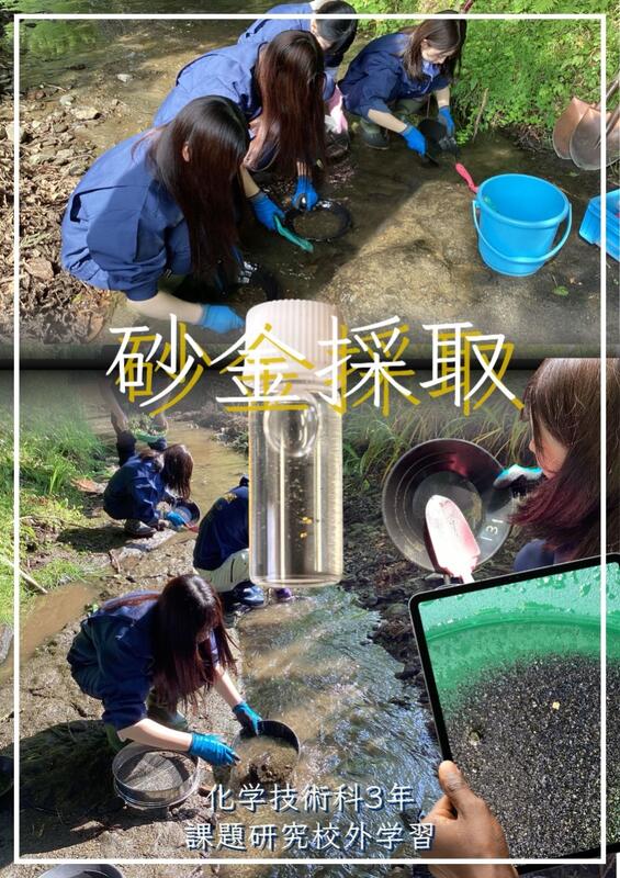 令和7年5月23日(金)化学技術科3年生による課題研究校外学習を行いました。涌谷町教育委員会の協力の下、地域の歴史を学び、砂金採り体験施設で練習を行った後、天然砂金採取を行いました。今後は、砂金にどのくらい金が含有されているか、元素分析を本校の電子顕微鏡を使用して行います。