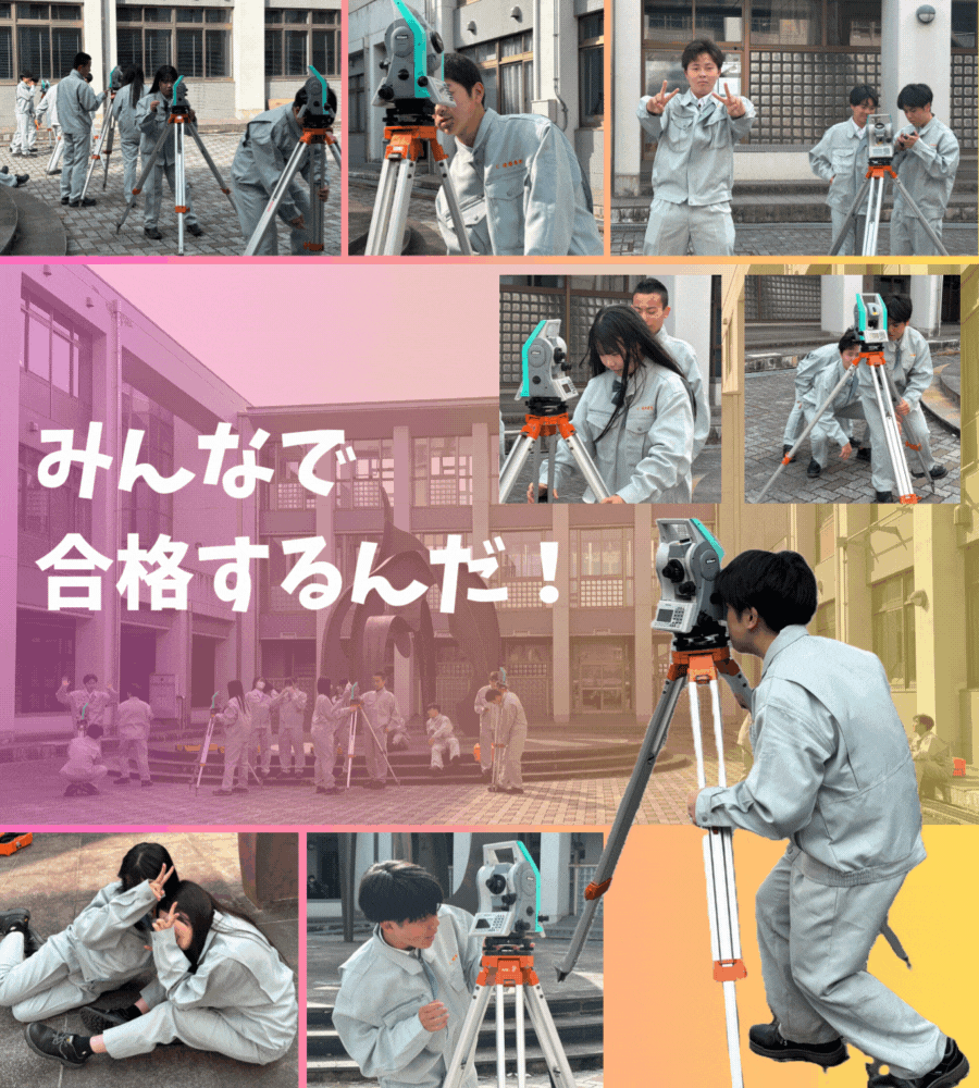 令和7年5月26日(月) 土木情報科1年生が、放課後残ってトータルステーションの据付を練習していました。今週木曜日が据付のテストなのだそうです!お互いにアドバイスし合ったり、お互いのタイムを測ったり、真剣に練習していました。これでみんな、合格間違いなし!