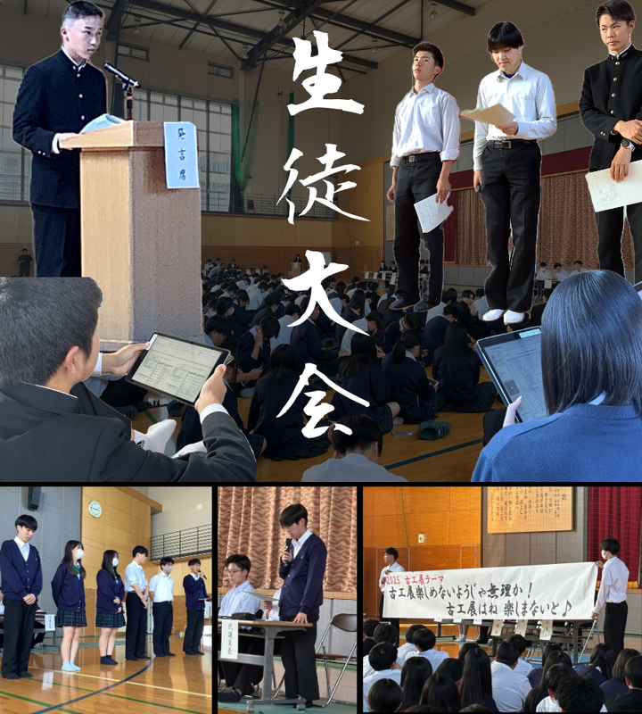 令和7年5月28日(水) 生徒総会を行いました。各クラスから集めた意見を学校へ提出し、先生方や事務室から回答をもらいました。また、各委員会の委員長から活動目標の発表、新体制の生徒会役員紹介や、今年度の古工展(文化祭)のテーマ発表を行いました。大変充実した総会となり、今後の学校生活へも期待が膨らみますね!