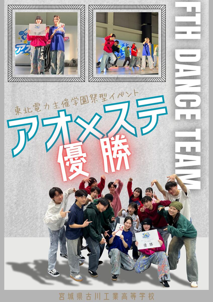 令和7年12月21日(日)にサンフェスタで行われた東北電力主催学園祭型イベント「アオ×ステ」のダンスステージに参加し、来場者からの投票の結果「優勝」することができました。他にもバンドステージや学生考案のオリジナルフードキッチンカーや、シンガーソングライターの有華さんのスペシャルライブで会場は盛り上がっていました。私たちのステージを見て一緒に盛り上がっていただき、誠にありがとうございました。引き続き応援よろしくお願いいたします。
