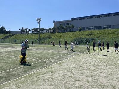 こんにちは。連日暑い日が続いておりますが、熱中症対策を行いながら練習を頑張っています。さて、令和5年7月26日に松山B&G海洋センターテニスコートにて宮城県工業高等学校ソフトテニス部のみなさんと合同練習を行わせていただきました。