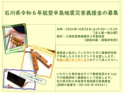 令和6年10月26日(土)古工展の一般公開において、建築研究部が石川県令和6年能登半島地震災害への義援金募集を実施しました。ご協力いただいた皆さまには、感謝の気持ちとして建築研究部が作成したスマホスタンドをお渡ししました。皆さまからいただいた寄付金は、近日中に郵便局窓口から救援団体へ義援金として送金する予定です。