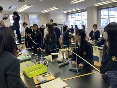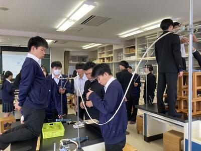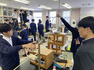 令和6年11月12日(火)建築科3年生「科学と人間生活」の授業風景です。力学的エネルギー保存の法則に基づき、鋼球を滑らせる実験をしています。生徒たちは条件を変えて速度や時間を計測し、試行錯誤を重ねながらコースを自由に設計しています。与えられた3つの課題をクリアするごとに点数が加算され、各班が点数を競う形式です。果たして、どの班が高得点をたたき出すでしょうか?生徒たちの真剣な表情から、白熱した競争がうかがえます!