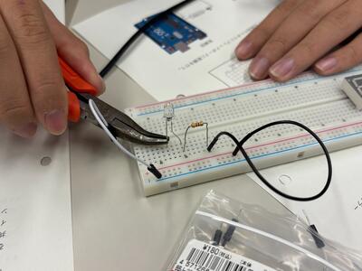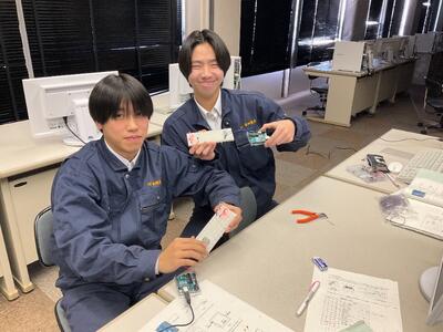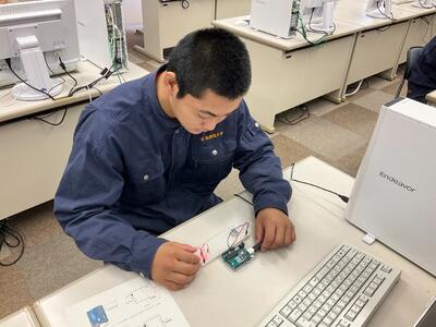 令和6年12月19日(木)2年生機械実習の最終ローテーションがスタートしました。その中から、4班に分かれて行う実習のうち「プログラミング実習」の様子をお届けします。この日は、マイコンの基礎知識を学びながら、電子部品の簡単な配線を行いました。