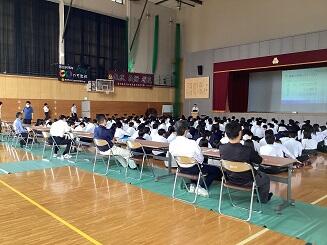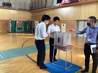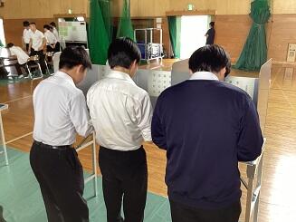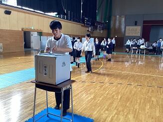 令和6年7月2日(火)6校時LHRの時間に、宮城県選挙管理委員会の方と大崎市選挙管理委員会の方をお呼びしての選挙出前講座がありました。クイズ形式で、選挙の予算(なんと600億円!)を学んだり、本物の記載台や投票箱を使った模擬投票を体験したりしました。選挙権を持つ年齢になり、もうすぐ働いて納税者となる3年生は、税金の使いかたや、どんな社会になって欲しいかを考える時間になりました。