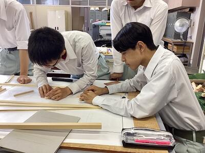 令和6年7月1日(月)土木情報科3年生、課題研究「橋梁模型班」の様子をお届けします。担当の先生方の監督のもと、自分たちで材料を切断・加工し、大判プリンターで印刷した図面に合わせて調整・組立していきます。立派な橋が完成するよう頑張ります!