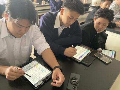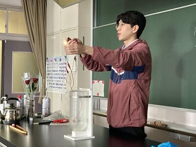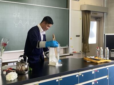 令和6年10月10日(木)機械科3年生の「科学と人間生活」の授業で、液体窒素で様々なものを冷却する実験をしました。生花と造花、抵抗と電池、酸素と二酸化炭素をそれぞれ-196℃に冷却したときの違いを比較して、粒子の熱運動について勉強しました。
