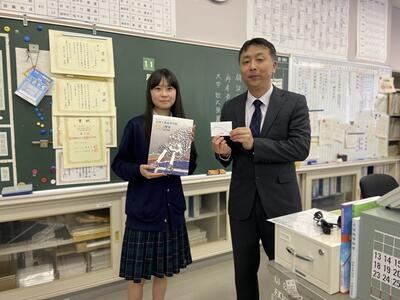 令和6年10月11日(金)に開催された本校創立90周年記念式典において、記念誌が関係者の皆さまに配布されました。その表紙デザインを手がけた建築科3年の千葉 琥珀さんに対し、教頭先生から感謝の言葉が贈られました。記念誌の作成にご協力いただき、ありがとうございました。