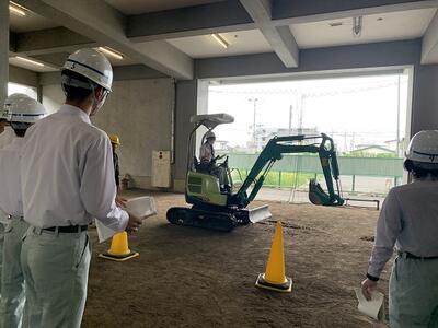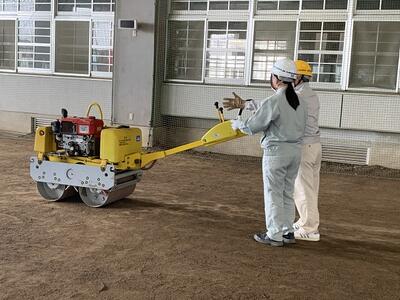 令和6年6月21日(金)土木情報科3年の土木情報実習「バックホー班」「(ハンドガイド)ローラー班」の写真です。危険な機械を扱うので、先生方の監督・指導のもと、しっかりとヘルメットをかぶり、真剣に実習に取り組んでいます。他に「単心曲線設置班」がありますが、その様子はまた後日掲載します。