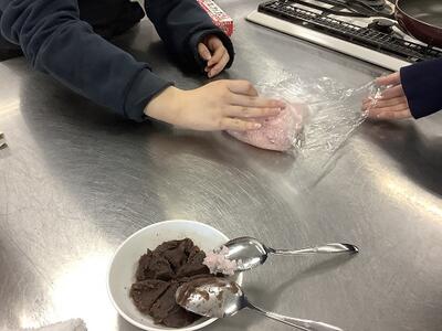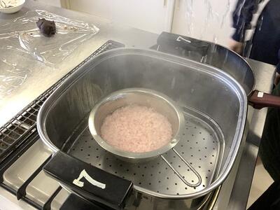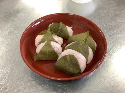 令和6年4月25日(木)選択科目のフードデザインの授業風景です。今日は、電気電子科と化学技術科の3年生が、春の季節に合わせて桜餅を作りました。時間内の完成に向けてグループで協力しながら行うことができました。美味しそうな桜餅が完成できたようですね。