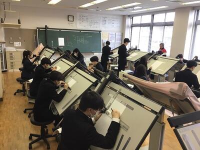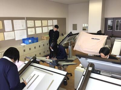 令和6年4月22日(月)土木情報科2年生、製図の授業の様子です。手描きの製図と、CADを用いた製図の2グループに分かれて学習しています。